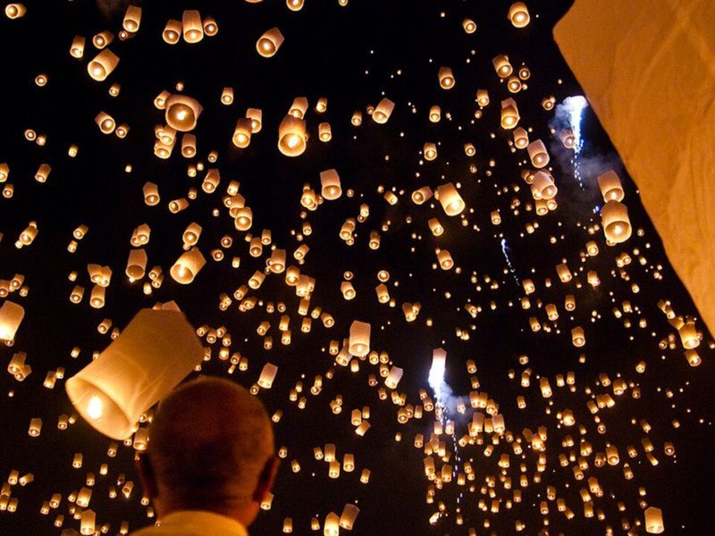 У этого торжества весьма почтенный возраст — его корни уходят во второе столетие до нашей эры. Согласно древнему поверью, именно в эту ночь души предков, которые спускались на землю, чтобы разделить с семьёй радость Нового года, возвращаются обратно в свой мир. И тысячи зажжённых фонарей освещают им путь, создавая в небе сияющую дорогу. Зрелище получается невероятно трогательным и поэтичным.
