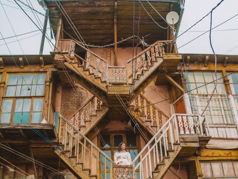 Во дворе дома на улице Цинамдзгвришвили, 49 скрывается архитектурный ребус — лестница, выложенная в виде трёхмерных ромбов. Деревянные конструкции создают оптическую иллюзию, приковывая взгляд. Даже бельевые верёвки, на которых сушат одежду, не портят впечатление, а лишь добавляют колорита этому необычному творению.