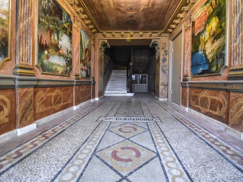 Роскошная парадная в доме табачных магнатов Сейлановых на улице Галактиона Табидзе, 18 — доказательство того, что Тбилиси не уступает Петербургу в величии подъездов. Под ногами — дата постройки, 1911 год, а стены украшены росписями, символизирующими разные части света. Это был не просто доходный дом, а личная резиденция братьев, что чувствуется в каждой детали.