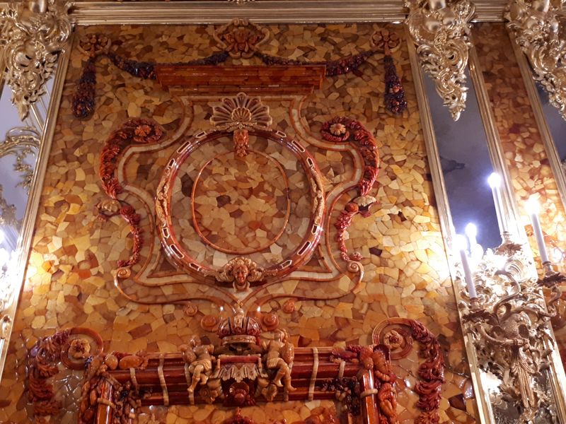 Янтарная комната — один из самых знаменитых интерьеров Екатерининского дворца. Она была создана в начале XVIII века в Пруссии, а затем подарена Петру I. В 1770-х ее панели были установлены в Екатерининском дворце. В отделке использовались янтарь разных оттенков, зеркала, резные украшения и мозаики, что делало комнату уникальным произведением искусства.