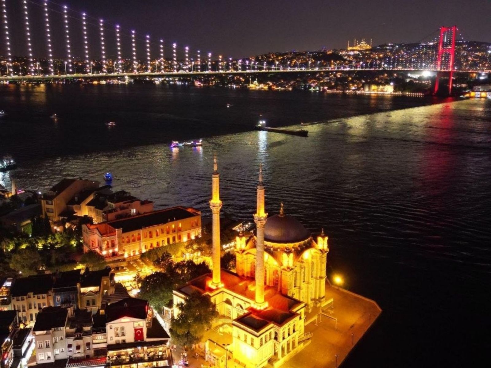 - Ортакёй — «местный Иерусалим» с мечетью, храмом и синагогой. Его узнаваемый силуэт подсвечен ночью;