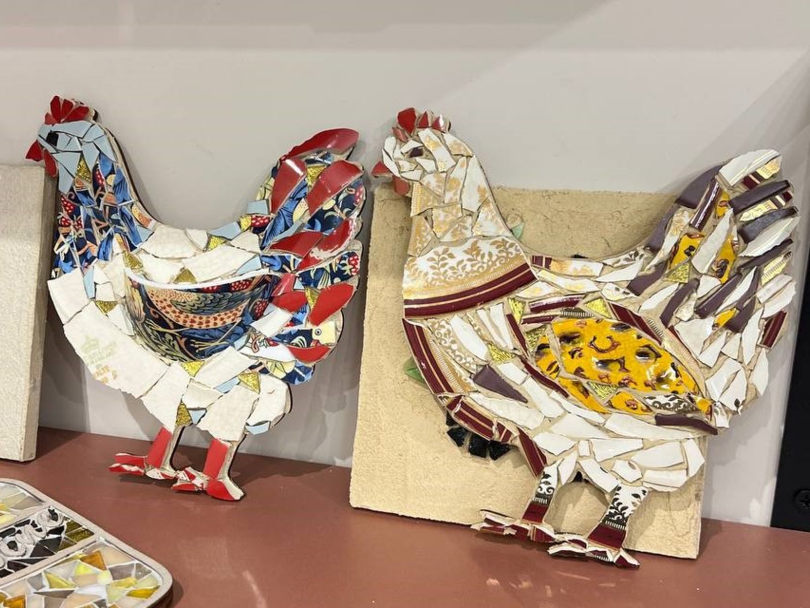 В этой технике работа создаётся вручную из фрагментов стекла и керамики: материалы свободно разбиваются, затем подбираются по оттенкам и фактуре и собираются в выразительную композицию без строгих правил и шаблонов.