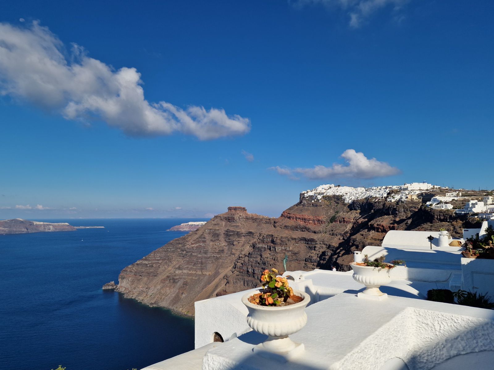 Насладимся видами на масштабную кальдеру, обитаемый островок Фирасья и необитаемые лавовые Палья Камени и Неа Камени.
